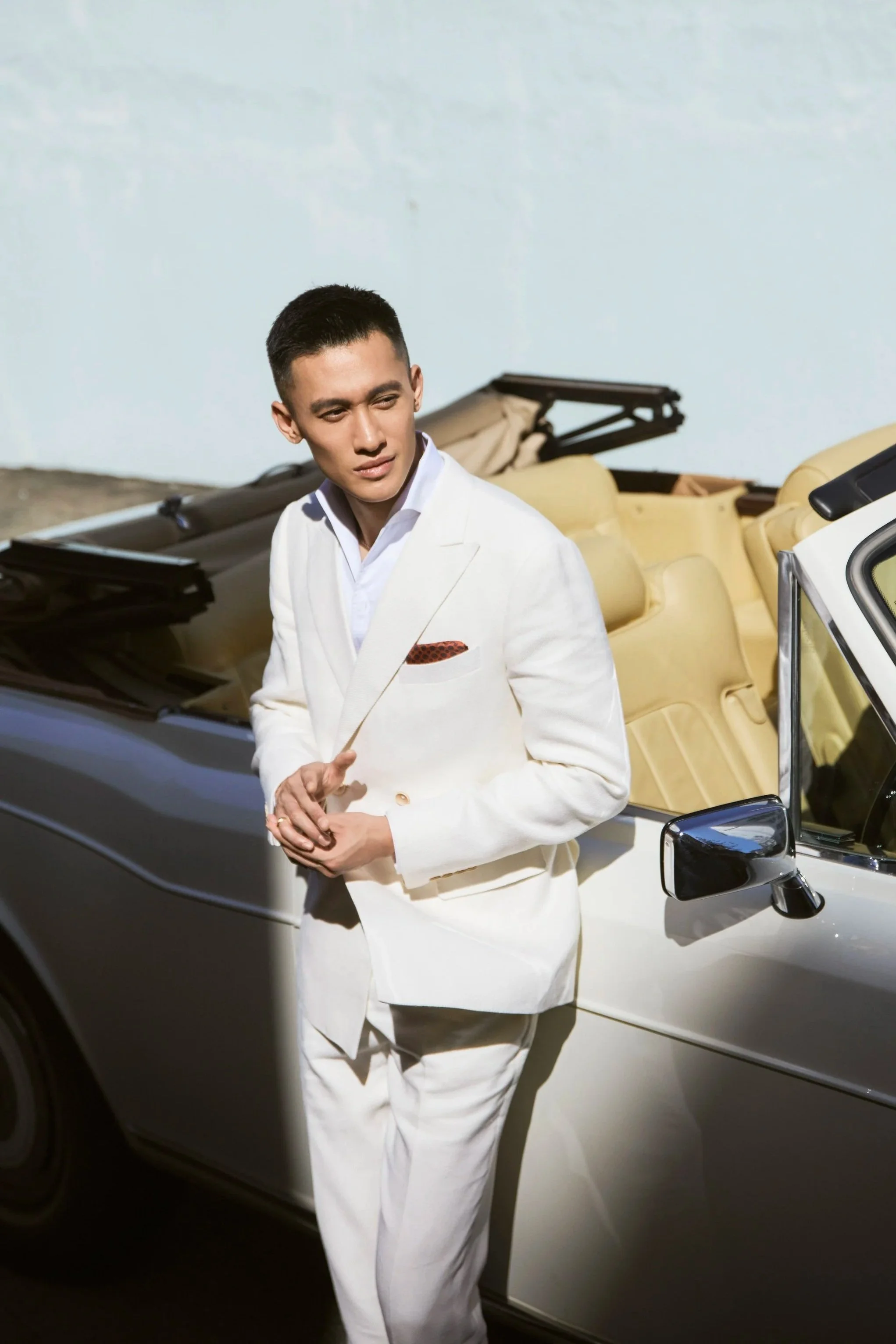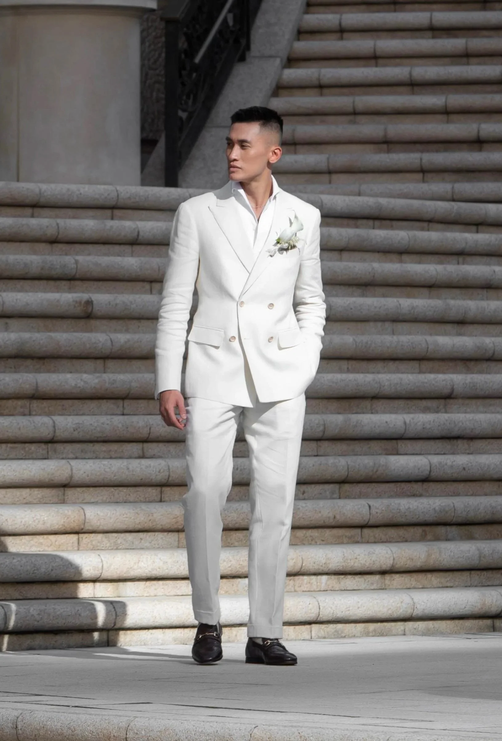 For Wilson’s outdoor garden ceremony, we selected a beautiful creamy ivory twill from Drapers — a luxurious blend of wool, silk, and cotton. The wool provides natural structure and resilience, the silk adds a subtle lustre and softness against the skin, and the cotton delivers exceptional breathability. The twill weave gives the cloth a refined texture that catches the light beautifully in photographs while remaining lightweight enough for Hong Kong’s humidity and a sunny garden setting. This combination ensured Wilson stayed cool and comfortable throughout the ceremony and reception without sacrificing sophistication.