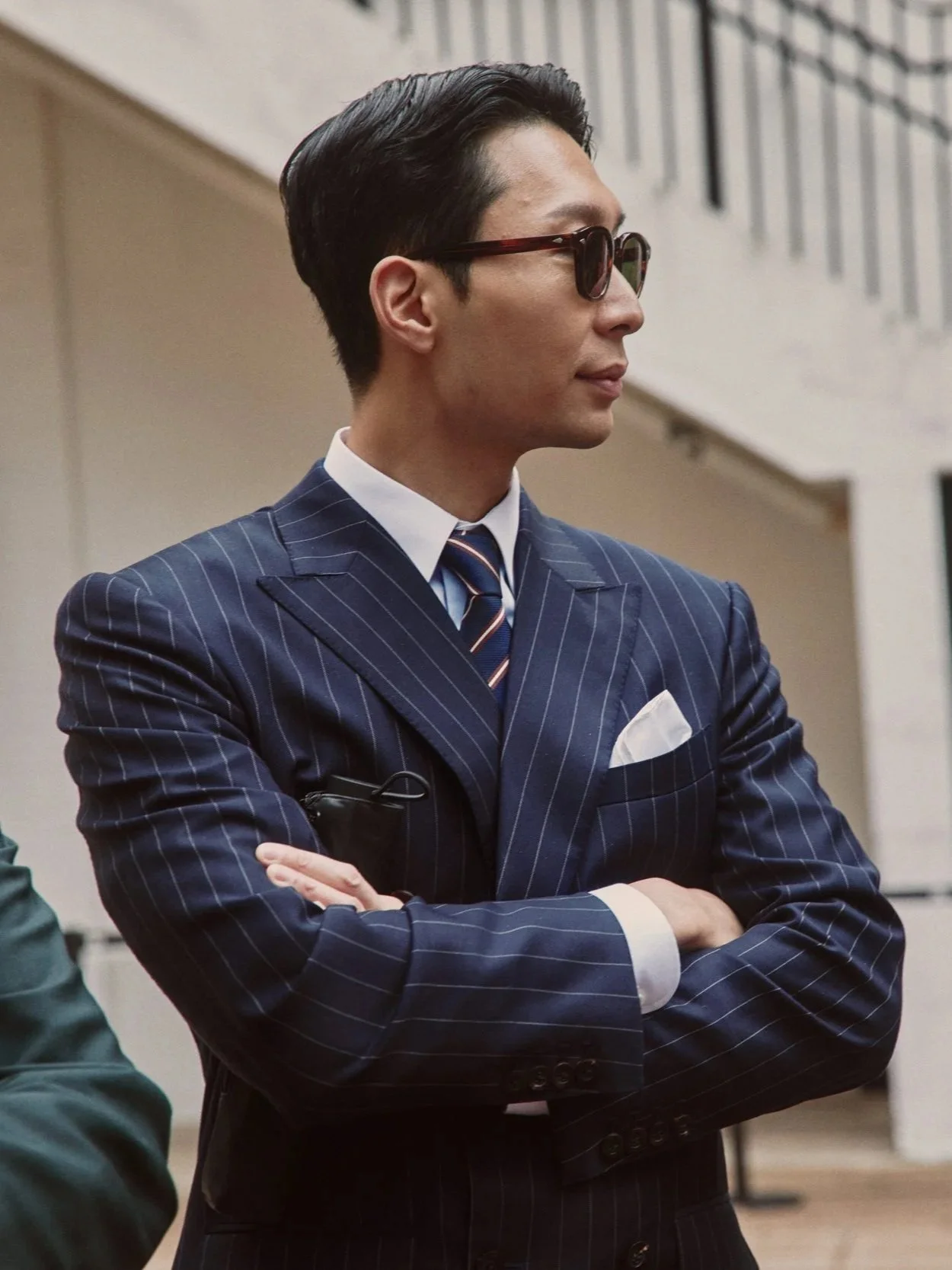 Given the British country club aesthetic, Matt chose to go with roped and structured shoulders, sharp shoulder lines supported by strong padding, and an overall fuller fit around the chest.