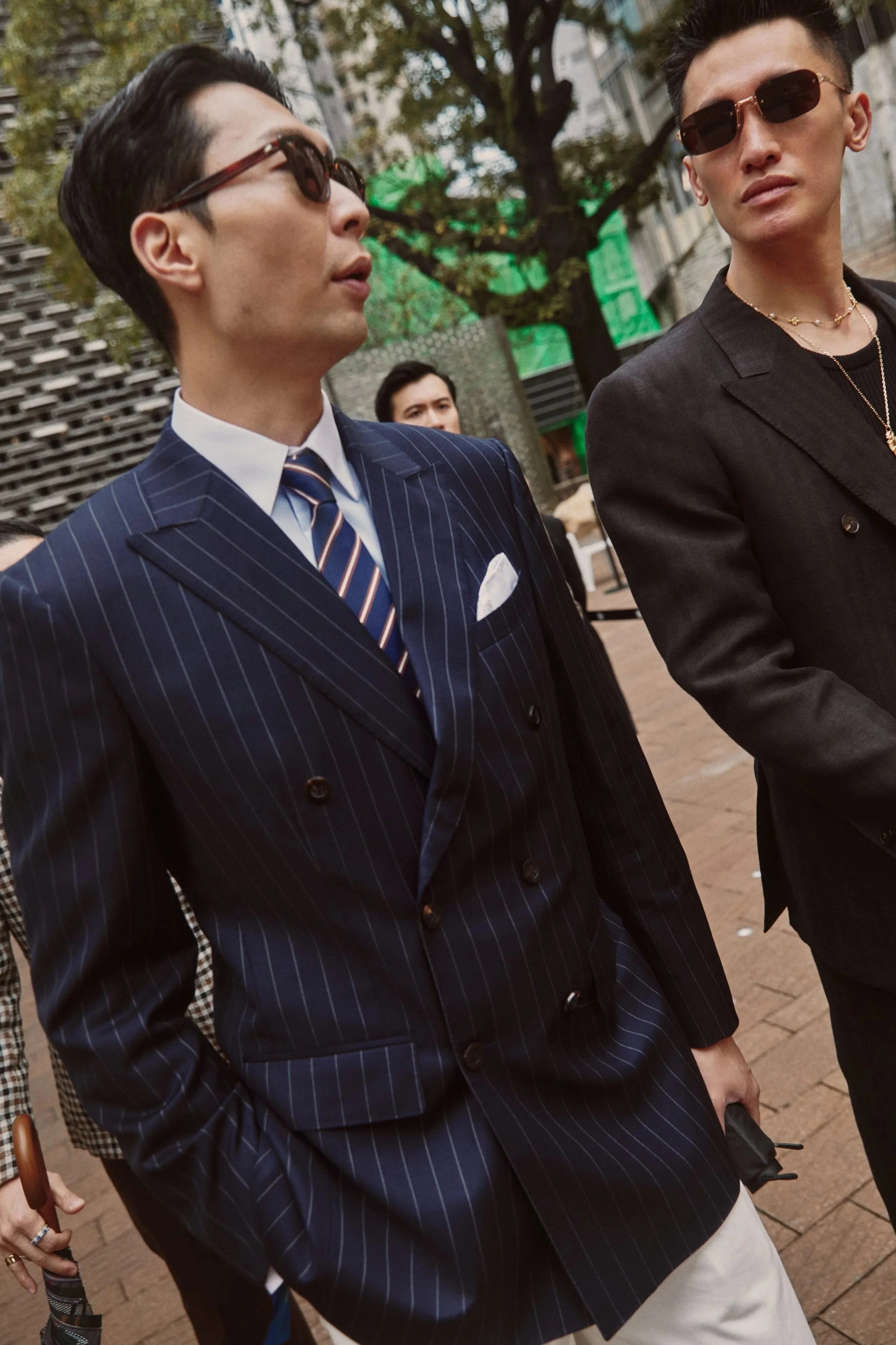 Darren styled his jacket with deeply roped shoulders to portray an overall structured, broad, and masculine silhouette.
