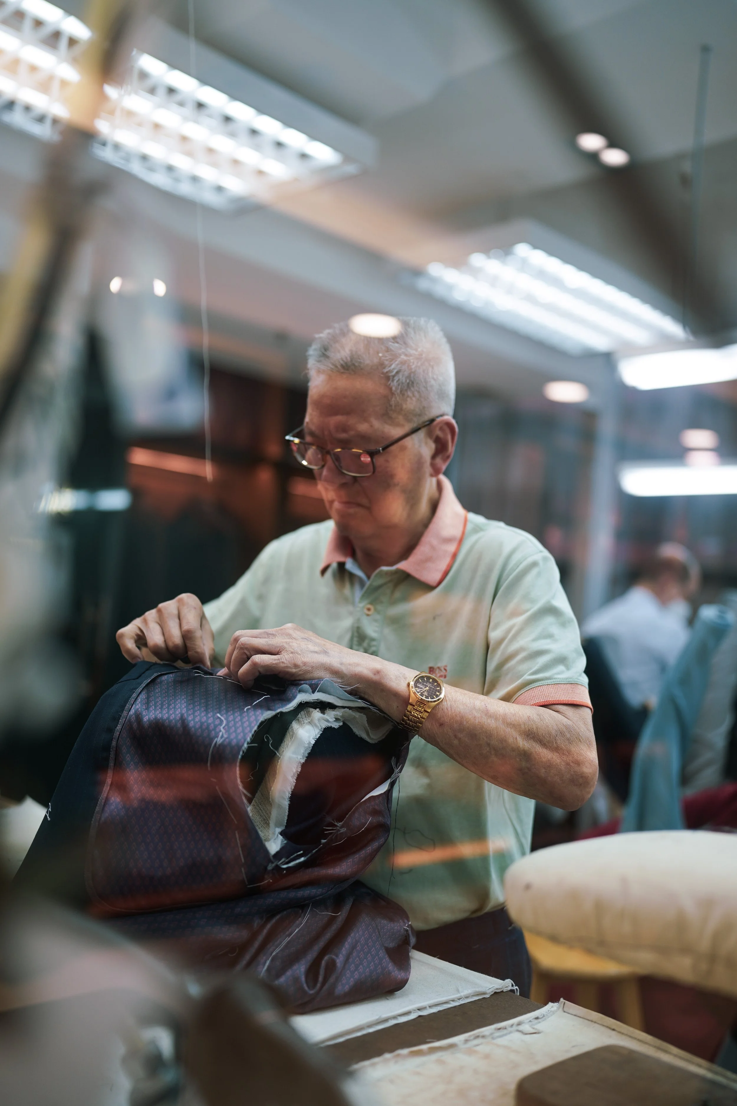 A lapel curve has to look effortless but takes three days of tiny stitches. A trouser crease must hold without starch, these men don’t rush. They don’t need to. They’re the last ones who can do it right, and they know it. The shop smells of wool and tea. Outside, Hong Kong rushes on. Inside, time slows just like it did thirty years ago.